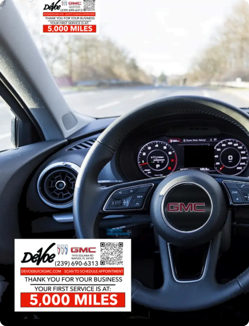 Removable POV Protection Stickers. Reminds Customers Every Day They Have Free Protection On Their Vehicle Now But Must Return To Dealer For Service To Continue Protection On Covered Components